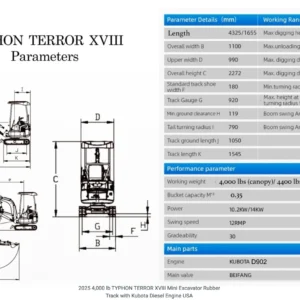 What’s Included: The TYPHON TERROR XVIII mini excavator machine comes with 1 x standard digging excavator bucket, as well as 1 x tool box, 1 x canopy, and 1 x digital manual with all the instructions.