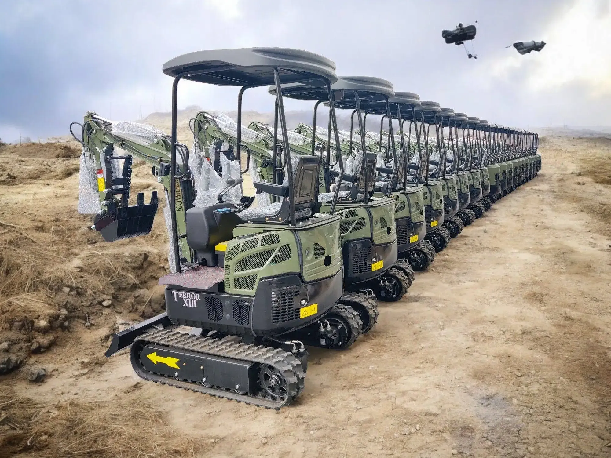 Introducing the TYPHON TERROR XIII Mini Excavator—a 1.3-ton trench digger equipped with a canopy and a hydraulic thumb clip, designed for small construction projects. This compact powerhouse is engineered for easy maneuverability and superior performance in various settings, including farms, gardens, public spaces, parks, orchards, and more.